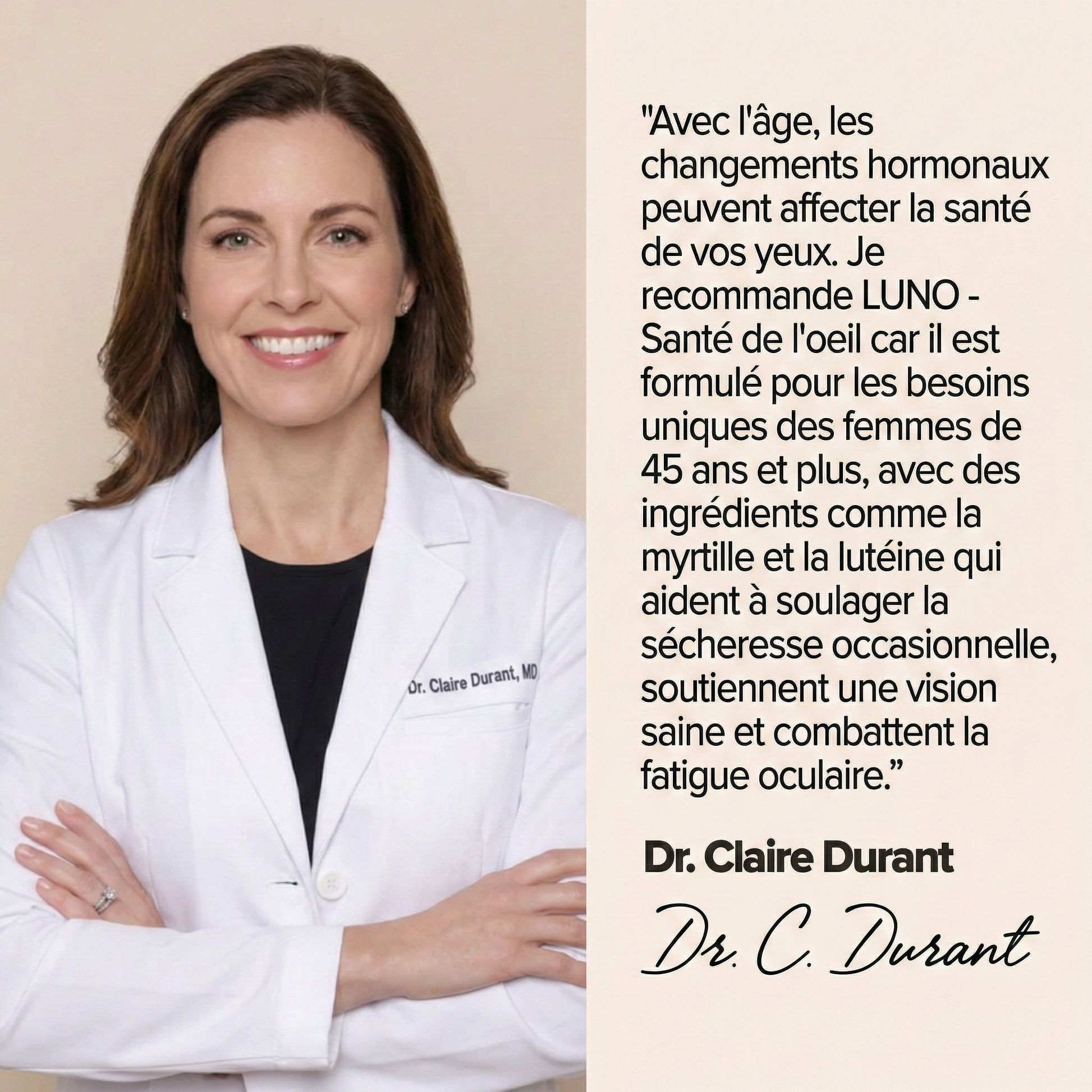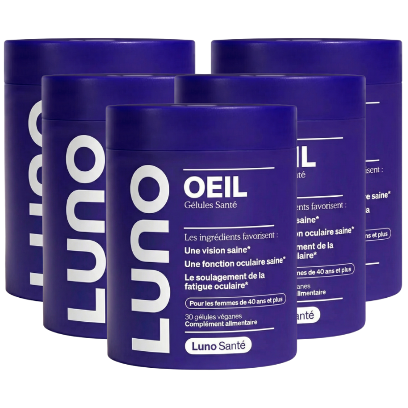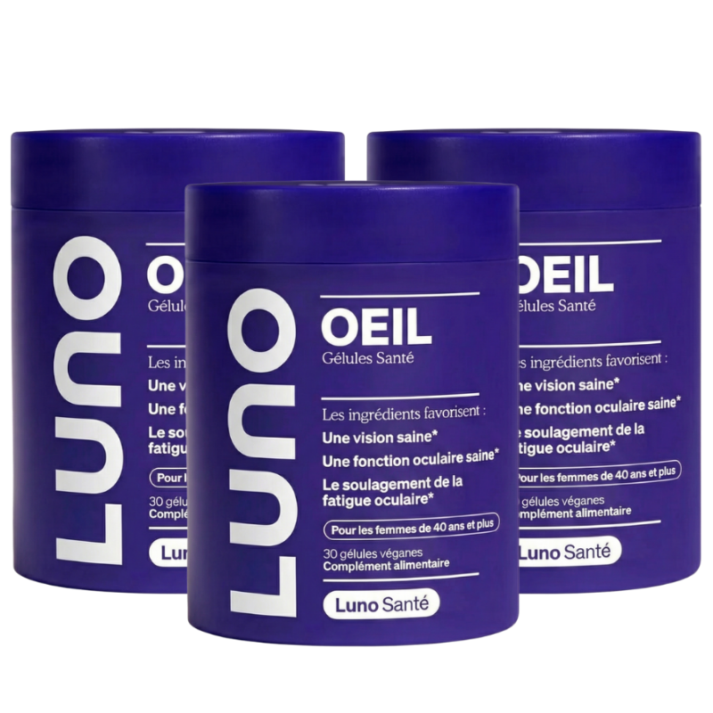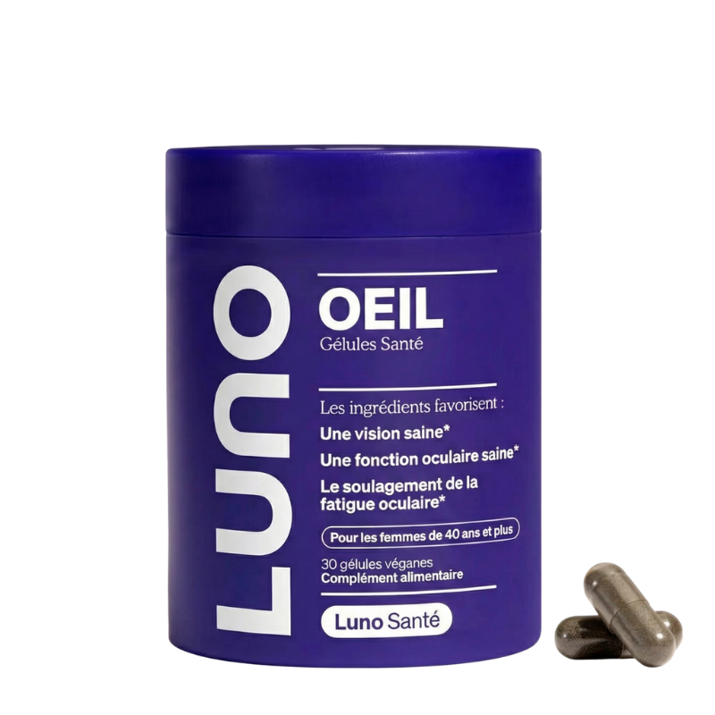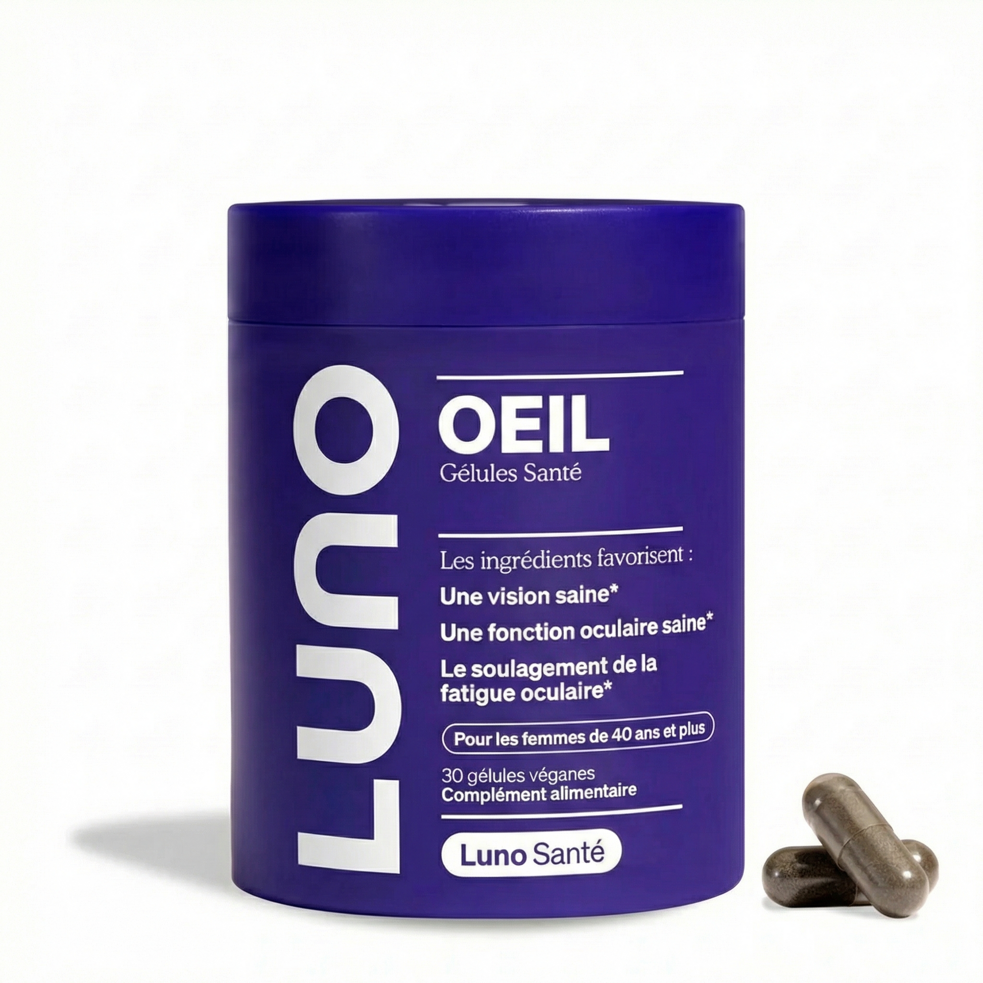 LUNO Santé de l'oeil est un complément alimentaire quotidien, sans hormones, qui soutient la santé des yeux et de la vision, soulage la fatigue oculaire occasionnelle et favorise une hydratation et un confort oculaires sains.*